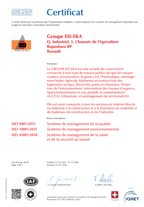 La certification est le résultat d’un travail indépendant fait par une organisation spécialisée. Pour le cas du Groupe EIS-EKA, les audits pour la certification ont été menés par l’Association Suisse pour Systèmes de Qualité et de Management (SQS). Ces audits ont été faits simultanément dans les domaines du Management de la Qualité (ISO 9001 : 2015), Management de l’Environnement (ISO 14001 : 2015), Management pour la Santé et la Sécurité au Travail (ISO 45001 : 2018). Cette deuxième certification couvre la période qui va du 22 mars 2024 au 13 novembre 2026.